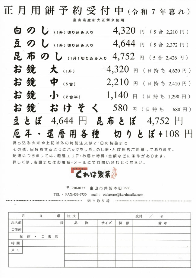 ご来店ご希望の方は、くれは製菓本店(富山市呉羽本町2951番地)